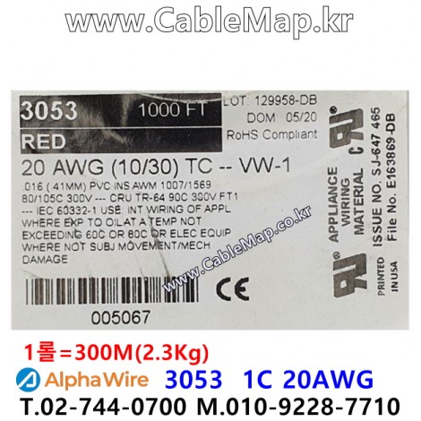 AlphaWire 3053, RED 1C 20AWG 알파와이어 300미터 > Hook-Up WireAlphaWire 카다로그 바로가기: www.cabletool.net