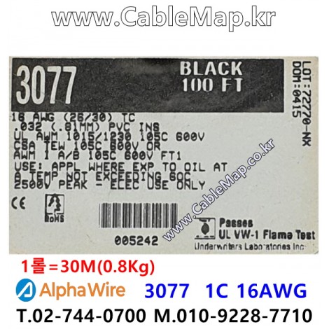 AlphaWire 3077, Black 1C 16AWG 알파와이어 30미터 > Hook-Up WireAlphaWire 카다로그 바로가기: www.cabletool.net