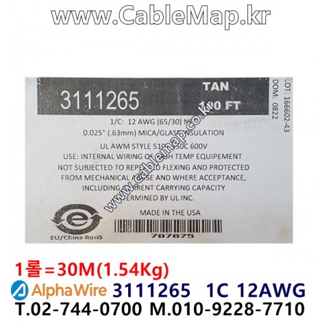 AlphaWire 3111265, 1C 12AWG UL AWM 5107, Operating Temperature -55°C to +538°C