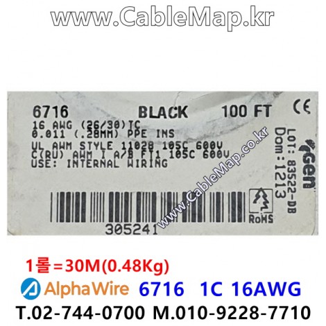AlphaWire 6716, 1C 16 AWG E163869-DB RU AWM 11028 105C 600V VW-1, CRU AWM I A/B 105C 600V FT1 CE ROHS